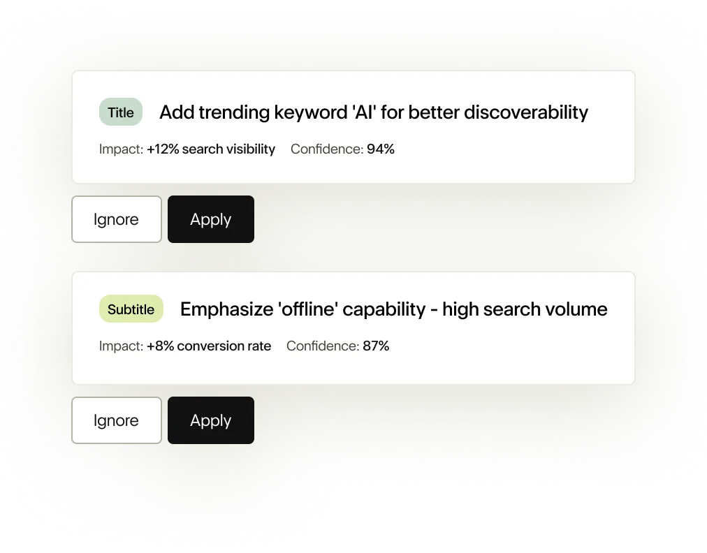 Optimize titles, descriptions, screenshots, and icons for store algorithms and user perception. Tappify helps you find winning formats.